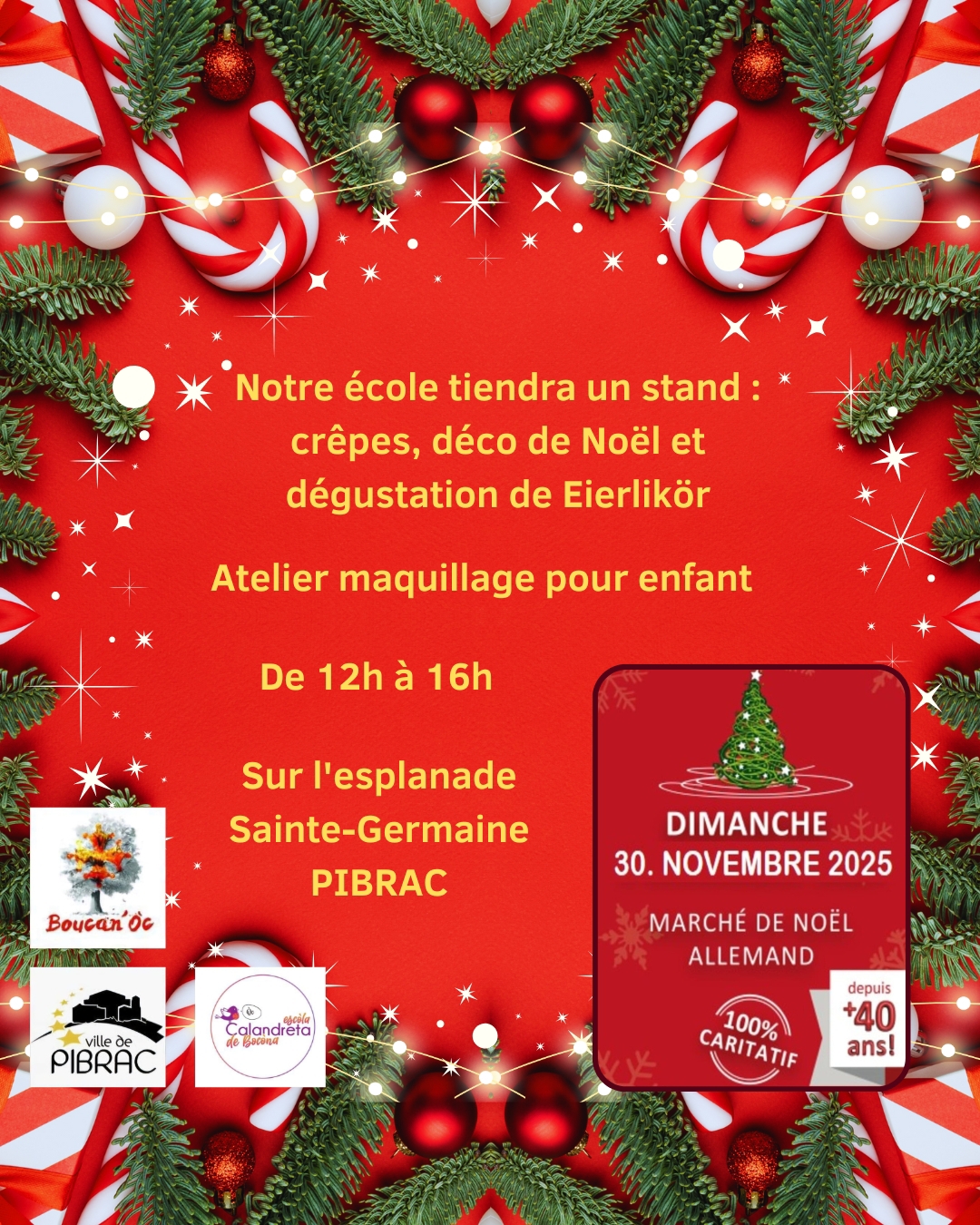 Rendez vous le dimanche 30 novembre 2025 sur l’esplanade de Pibrac de 12h00 à 16h00 où nous vendrons des décoration de Noël, des crêpes et de la Eierlikör en dégustation. Nous animerons aussi un stand maquillage d’enfant